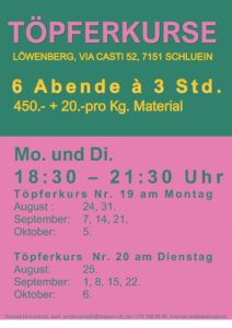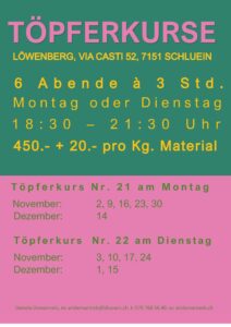 Kosten: 6x a 3 Std. = 450.- + 20.-/ Kg  Für Material, Glasur und Brennen. Einzelstunden auf Anfrage.